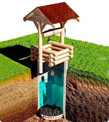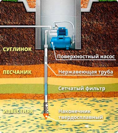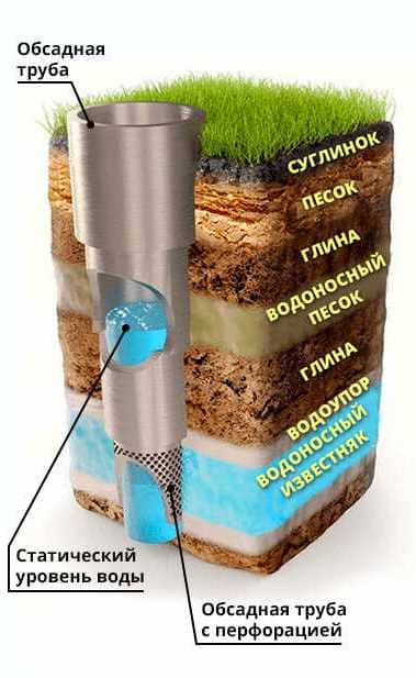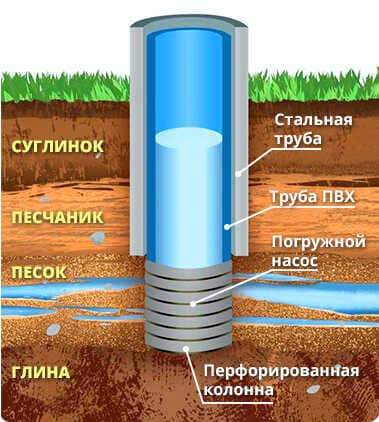 Состоит из: оголовка, обсадной колонны, труб НПВХ, бетонной заливки, герметика, насоса, перфорированной колонны